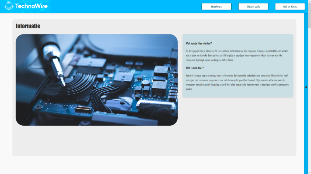 Voor deze opdracht moesten ik, samen met mijn groepje, een website bouwen voor het bedrijf TechnoWire. De klant wou specifieke kennis over te dragen aan Nederlandse jongvolwassenen. Deze kennis is gericht op alles wat met computers te maken heeft zoals de geschiedenis, de werking, de mogelijkheden en de toekomstige ontwikkelingen. Wij zijn begonnen door eerst informatie te verzamelen en een layout bedenken voor hoe de website eruit moest komen te zien. Vervolgens hebben wij volgens het verkregen plan van eisen de website in HTML/CSS gemaakt. Dit was de tweede website die ik ooit heb gemaakt en er is aanzielijke verbetering te zien. Ik ben erg tevreden over het resultaat en ben er ook redelijk trots op.